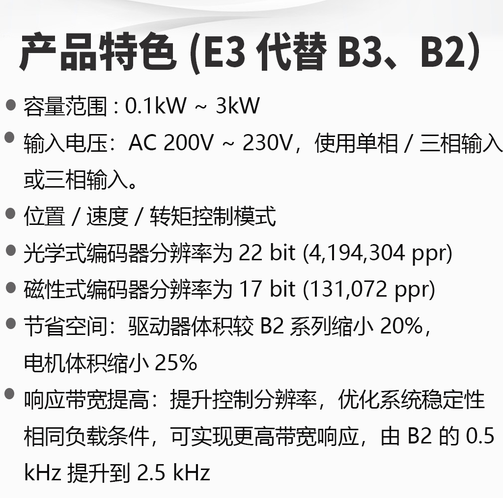 节省空间:驱动器体积较B2系列缩小 20%,电机体积缩小25%