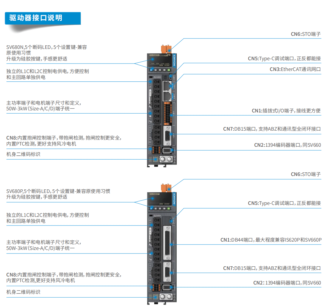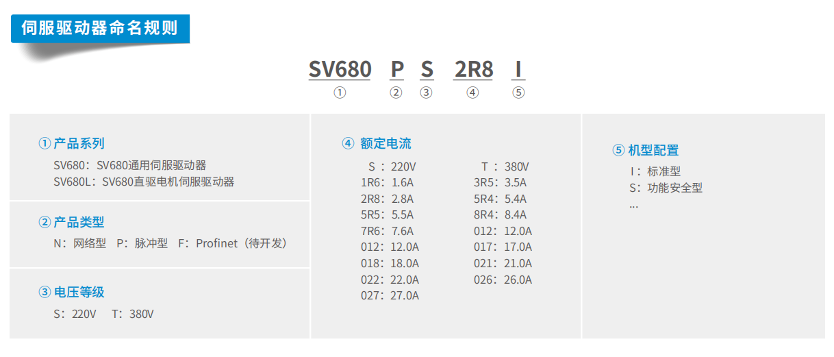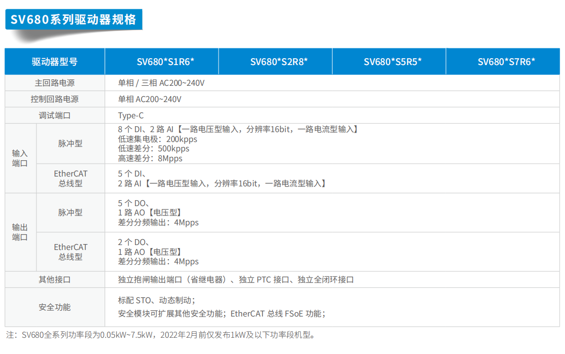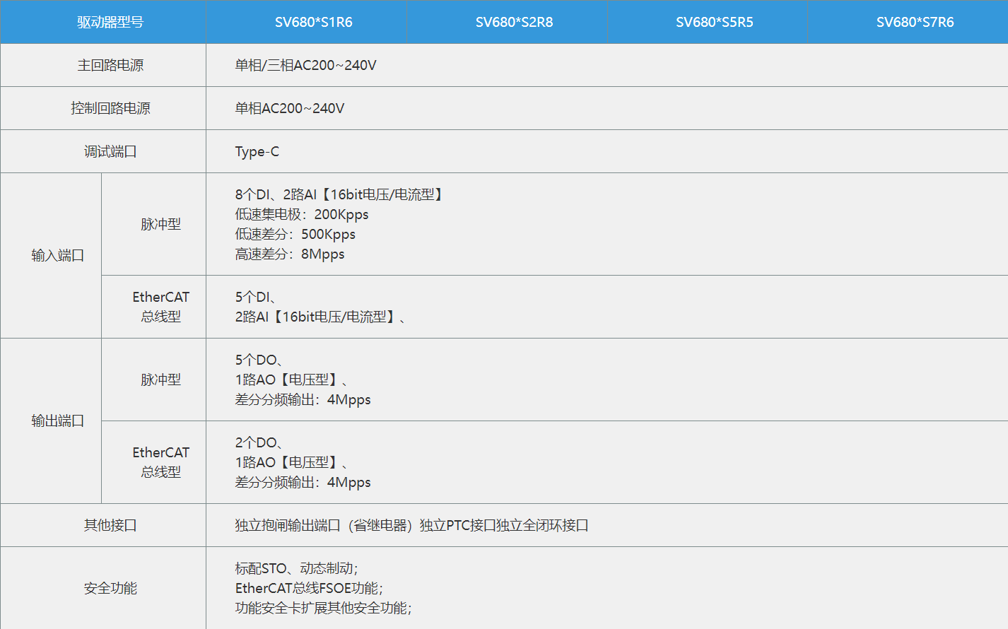 SV680系列旗舰型伺服驱动器融合汇川汽车级质量设计标准与完善的可靠性分析和测试方法,提供5年整机质保服务。3.5KHz速度环带宽,8Mpps最高脉冲指令输入,26bit安全型多圈绝对值电机,7000rpm最高转速。标配STO与动态制动,标配EtherCAT总线FSoE功能,扩展SS1/SS2/SLS/SBC/SOS/SSM/SDI功能,内置抱闸输出与PTC检测,CE/UL/KC/TUV认证。